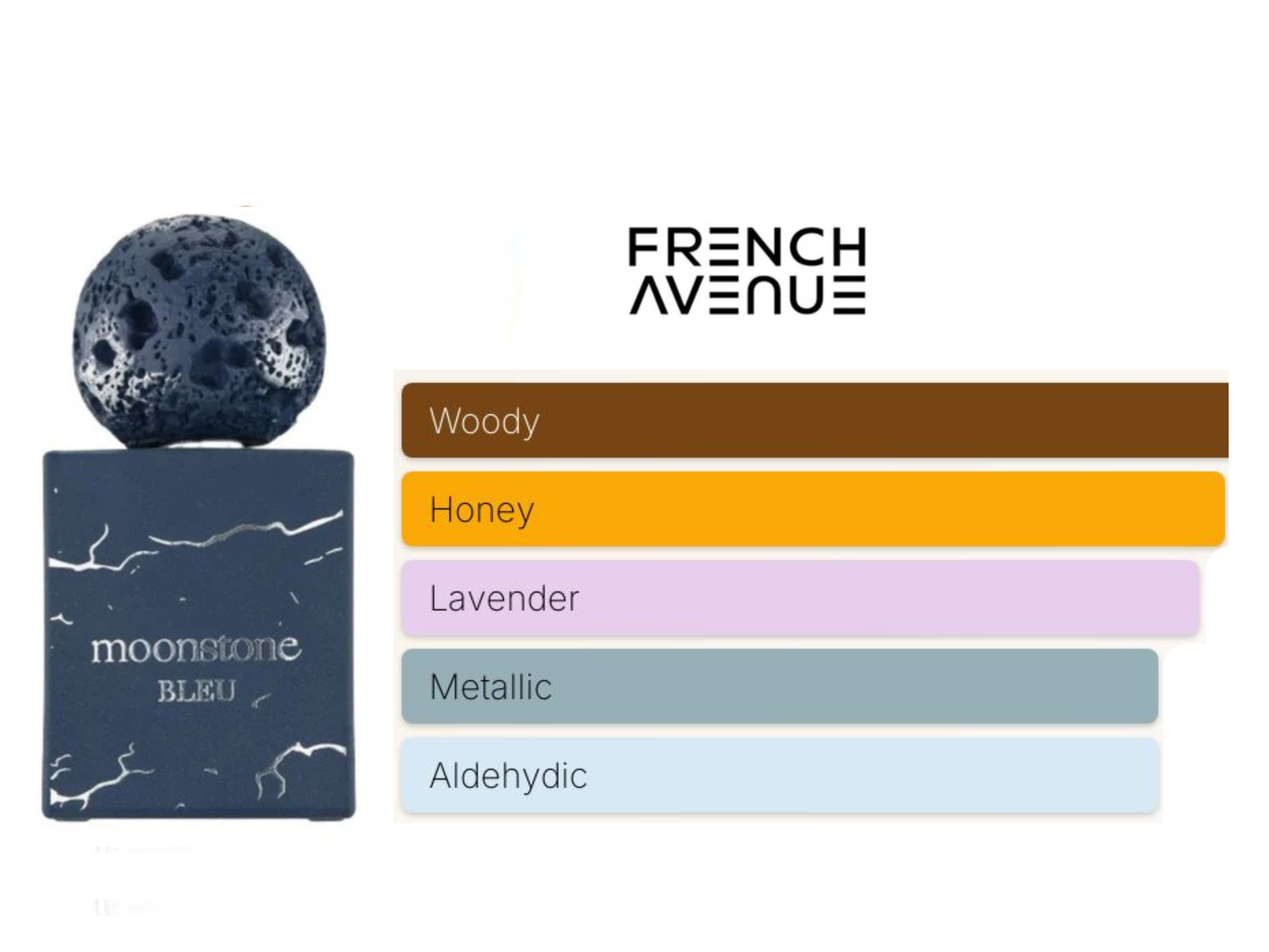 French Avenue Moonstone Bleu er en sofistikert unisex-duft med frisk, metallisk og treaktig karakter. Den åpner skarpt og aromatisk med aldehyder, fiolblad, sort pepper og kardemomme. Hjertet balanserer friskhet og varme med lime, bivoks, lavendel og lær. Basen er rik og sensuell med hvit musk, amber, vanilje, honning, patchouli og sedertre.
